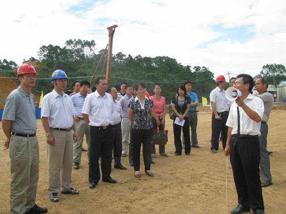 6月20日,自治區交通運輸廳副廳長李小林(左一)一行視察我公司參建的防城港至東興公路、欽州沙井大道、沿海高速公路改擴建茅尾海出口工程項目。