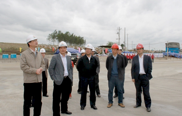 圖為:交通運輸廳副廳長梁毅(右二)、崇左市委書記趙樂秦(右三)、崇左市副市長張鴻(左一)在項目現場檢查調研