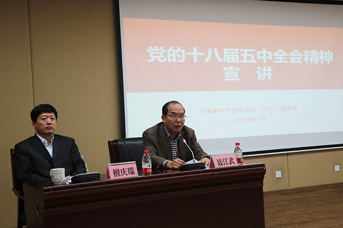 自治區(qū)環(huán)境保護(hù)廳廳長(zhǎng)檀慶瑞作宣講,自治區(qū)國(guó)資委副主任、黨委副書(shū)記、巡視員聶江武主持宣講會(huì)。