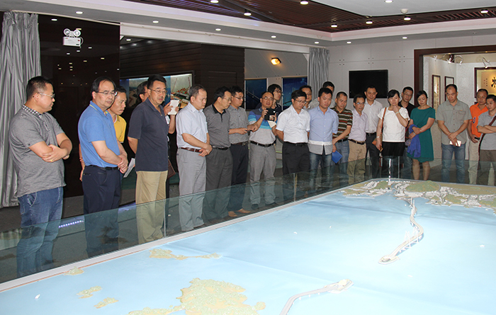 在港珠澳大橋管理局展廳,管理局蘇權科總工程師向考察團介紹了港珠澳大橋建設背景、工程概況、技術難點、工程進展等情況。集團公司學習考察人員就工程建設管理模式、防災減災設計、耐久性設計、沉管對接方案、人工島筑島工藝等問題與大橋項目管理人員進行了探討交流。