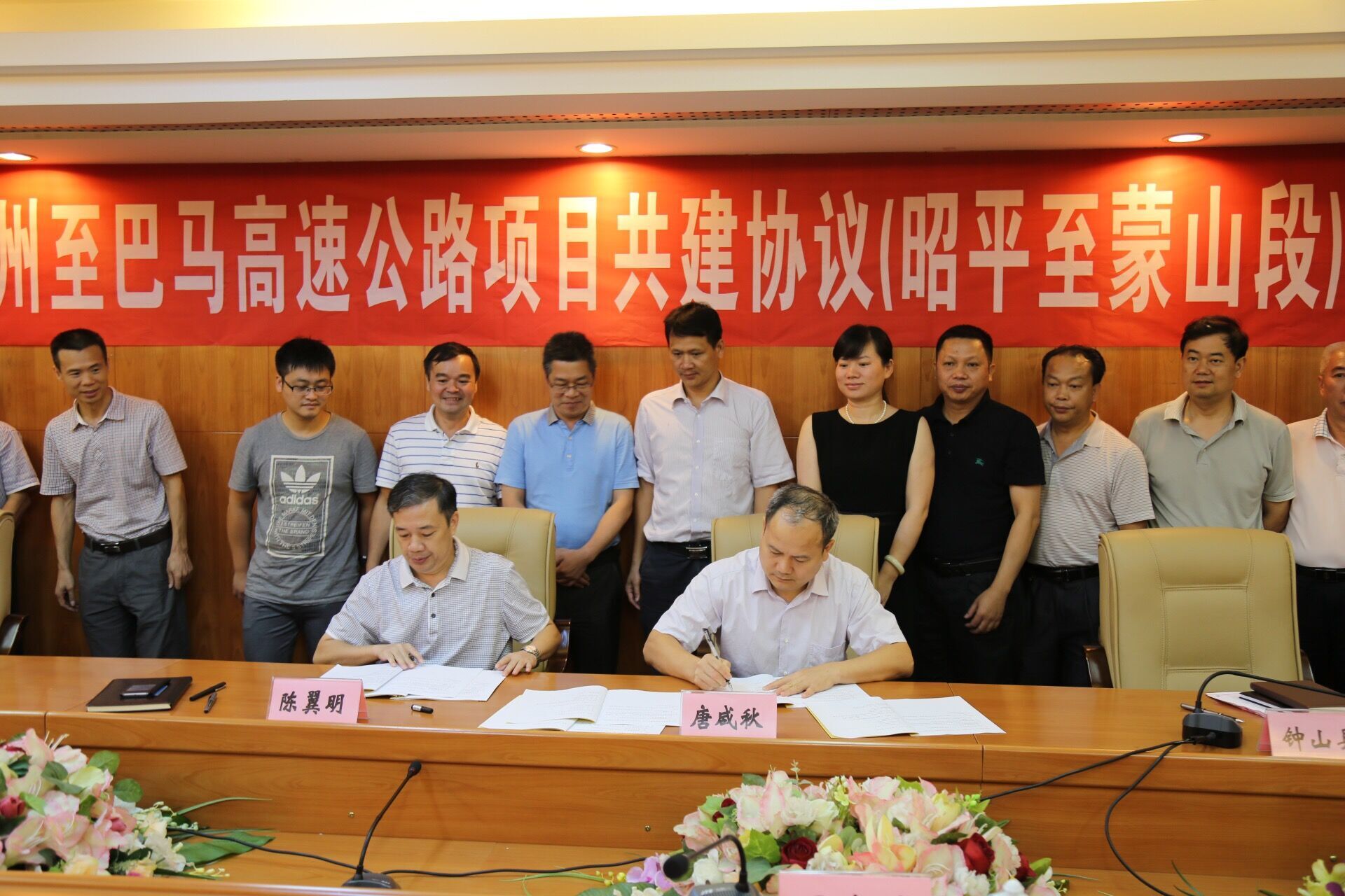 賀州市副市長陳翼朋,集團公司副董事長、總經理、黨委副書記唐咸秋,賀州市副秘書長楊啟迪,集團公司投發部部長朱政敏,集團公司直屬新恒通公司董事長、總經理馮春萌出席簽約儀式。