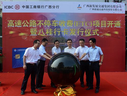 8月25日上午,中國工商銀行廣西分行與集團公司舉行高速公路不停車收費(ETC)項目開通暨八桂行卡發(fā)行儀式,標志著工行ETC業(yè)務在廣西正式啟動。集團公司董事、副總經理劉明洪,工行廣西區(qū)分行副行長楊永等領導出席儀式并致辭。