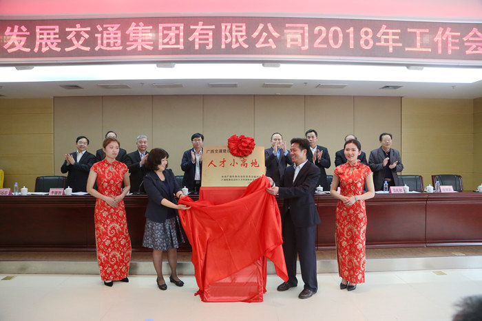 會后,自治區(qū)國資委副巡視員鞏學(xué)青與集團(tuán)公司黨委書記、董事長朱堅(jiān)和一同為集團(tuán)公司“廣西交通建設(shè)人才小高地”揭牌。