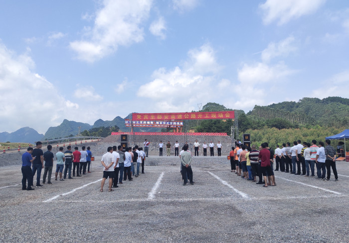 開工現場會在河池市都安瑤族自治縣召開。廣西北部灣投資集團有限公司黨委副書記、副董事長、總經理高新宣布項目開工。自治區高速公路管理局局長周北,河池市委常委、市人民政府常務副市長韋朝暉等領導參加會議。