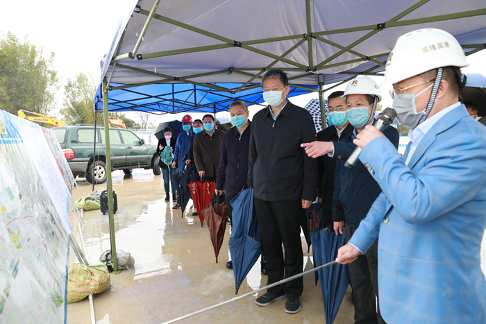 自治區副主席費志榮(右四)到吳隆路施工現場調研交通項目復工建設情況